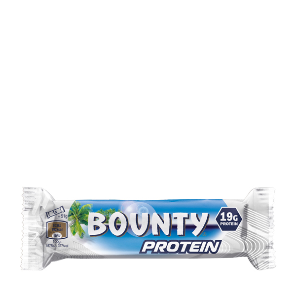 Bounty Protein Bar, baton proteic, care arată și are un gust la fel ca batonul clasic Bounty, cu până la 19 g de proteine și cu un conținut redus de carbohidrați, zahăr și de grăsimi. Gustul rămâne același de baton de ciocolată cu nucă de cocos, practic nici nu-l distingeți de batonul clasic ”Bounty”.